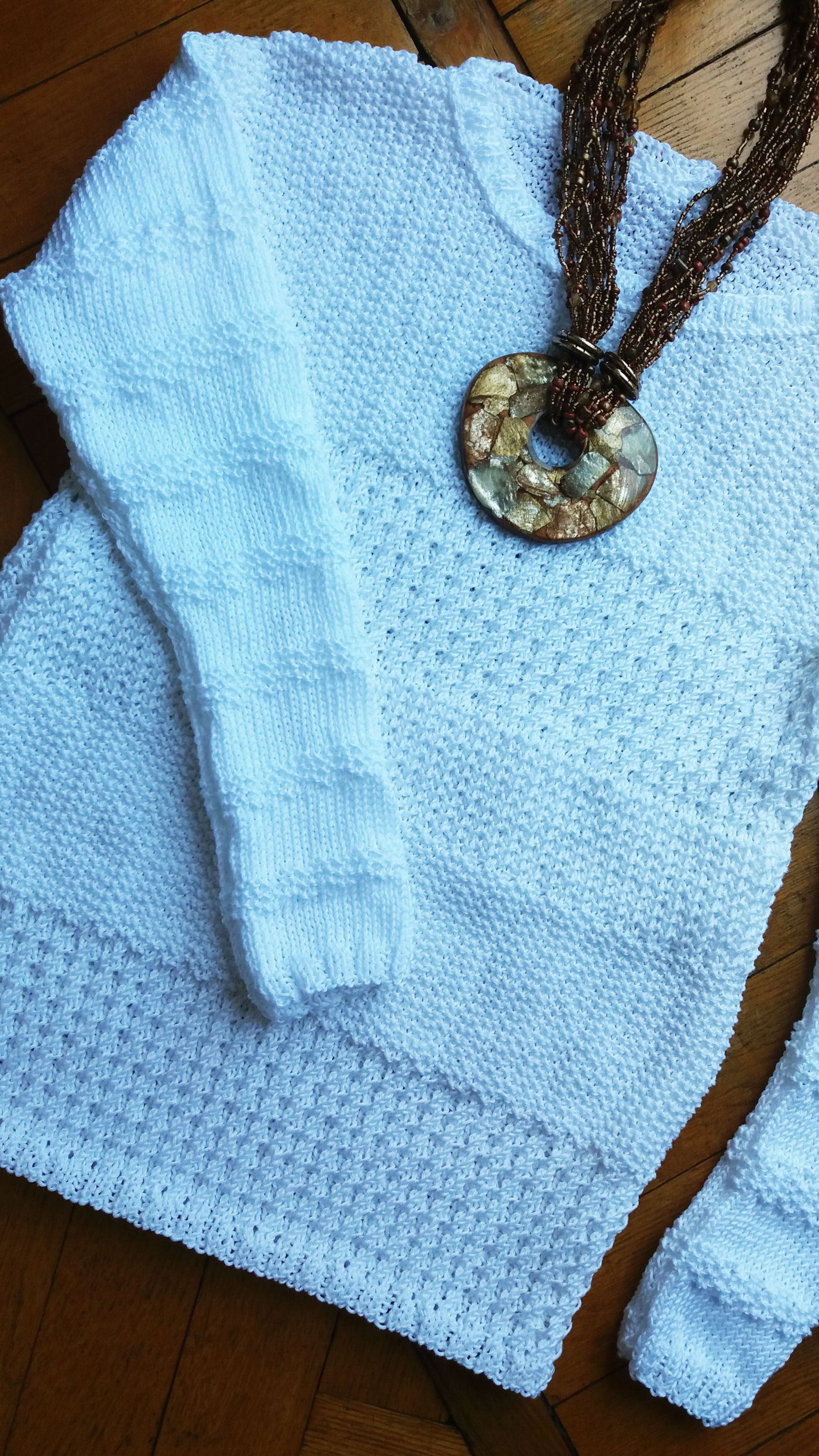 Questa maglia a girocollo in puro cotone Pima bianco ottico, è caratterizzata da differenti punti fantasia, come il punto “spighe mosse dal vento”, “grana di riso doppia”, e rete. Nel dettaglio potete osservarli bene nelle foto:
