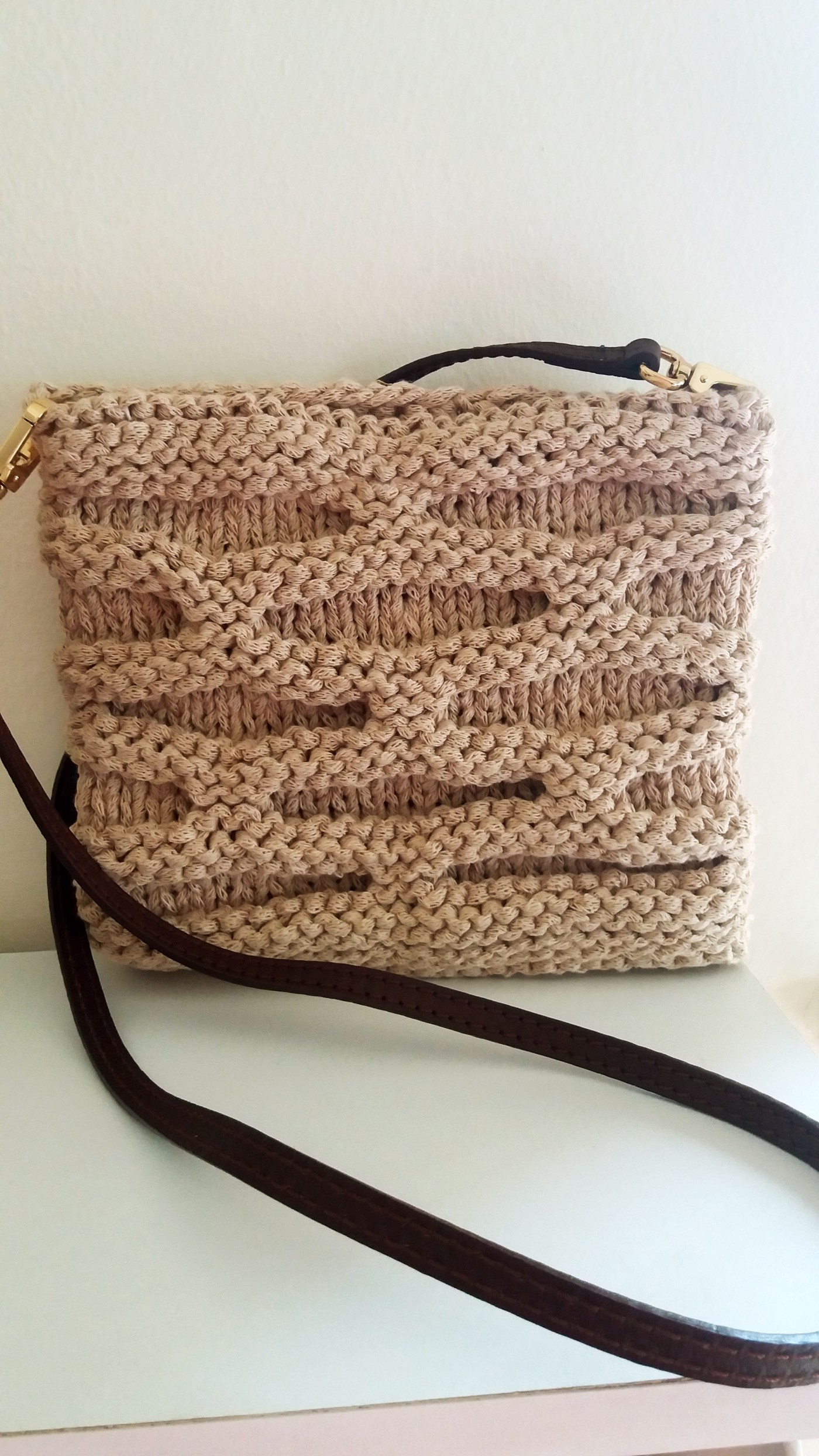 Questa shoulder bag è di media misura, caratterizzata da un punto geometrico alternato, ed è realizzata con una fettuccia di cotone color ecru, utilizzando dei ferri numero 5. All’interno è foderata in cotone tono su tono e chiusa con due piccoli bottoncini a pressione. La tracolla è in vera pelle color testa di moro. E’ comoda e versatile, ben abbinabile sia con un look casual che con uno più elegante. Il colore è neutro quindi lega bene con ogni tonalità!