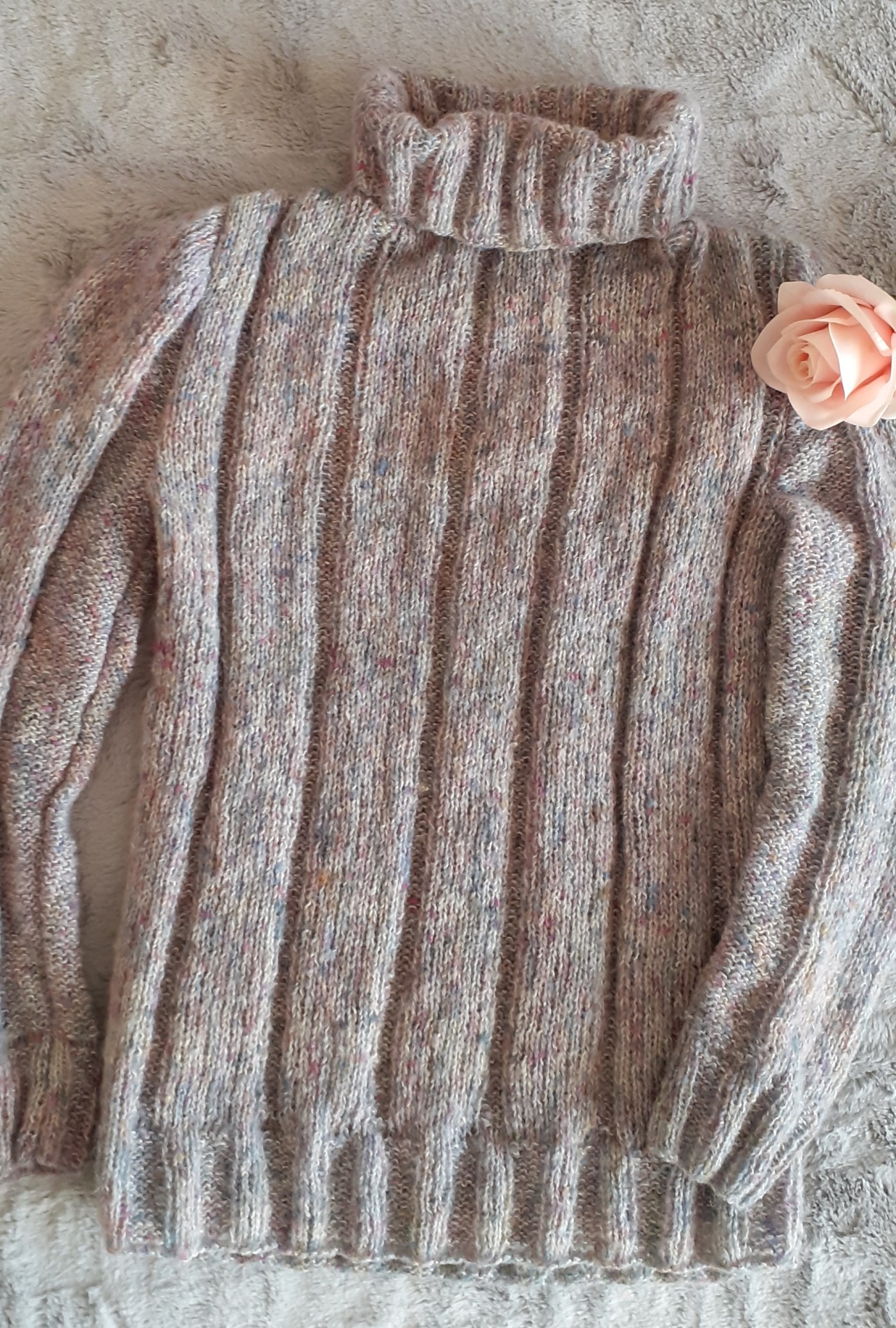 E’ ispirandomi a questo stile che ho realizzato questo maglione in lana mohair, super caldo e morbidissimo, ma leggero come una piuma. Il filato ha sfumature multicolori che virano dal rosa cipria, l’azzurro polvere, il grigio tortora e il verde salvia. La lavorazione è semplice, solo coste grosse 3/4 che si alternano. Addosso sembra di essere avvolti da un caldo abbraccio che regala una sensazione di benessere e tenerezza!