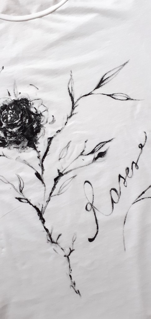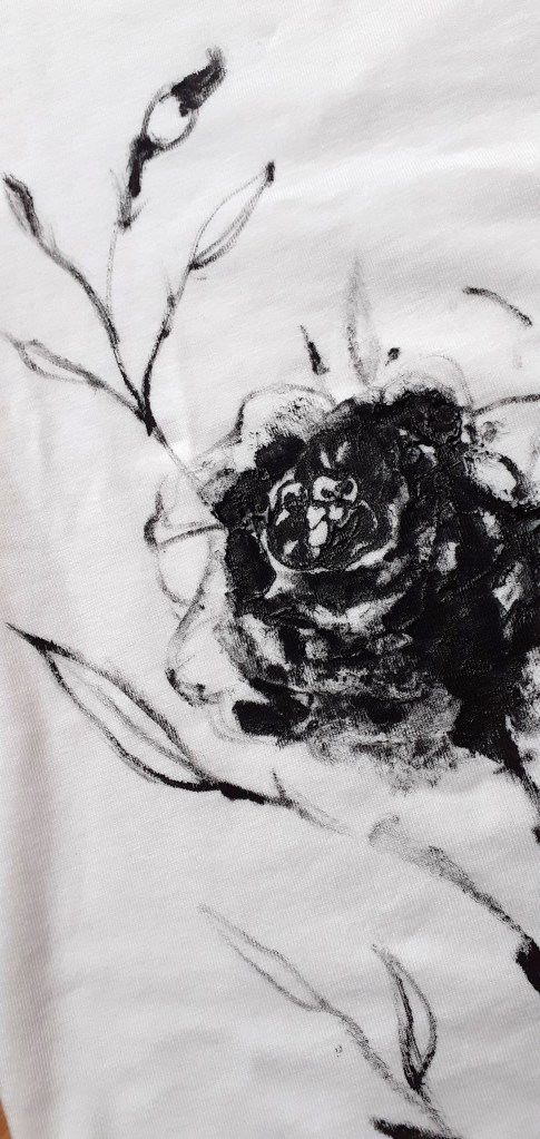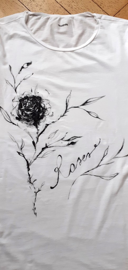E poi succede che nel giro di cinque minuti ti viene l’ispirazione e vuoi lasciartela scappare? Funziona così a noi artisti! Allora prendi una vecchia t-shirt bianca che stavi per buttare via, pennello e colore per tessuti e ti lasci andare alle emozioni!!!