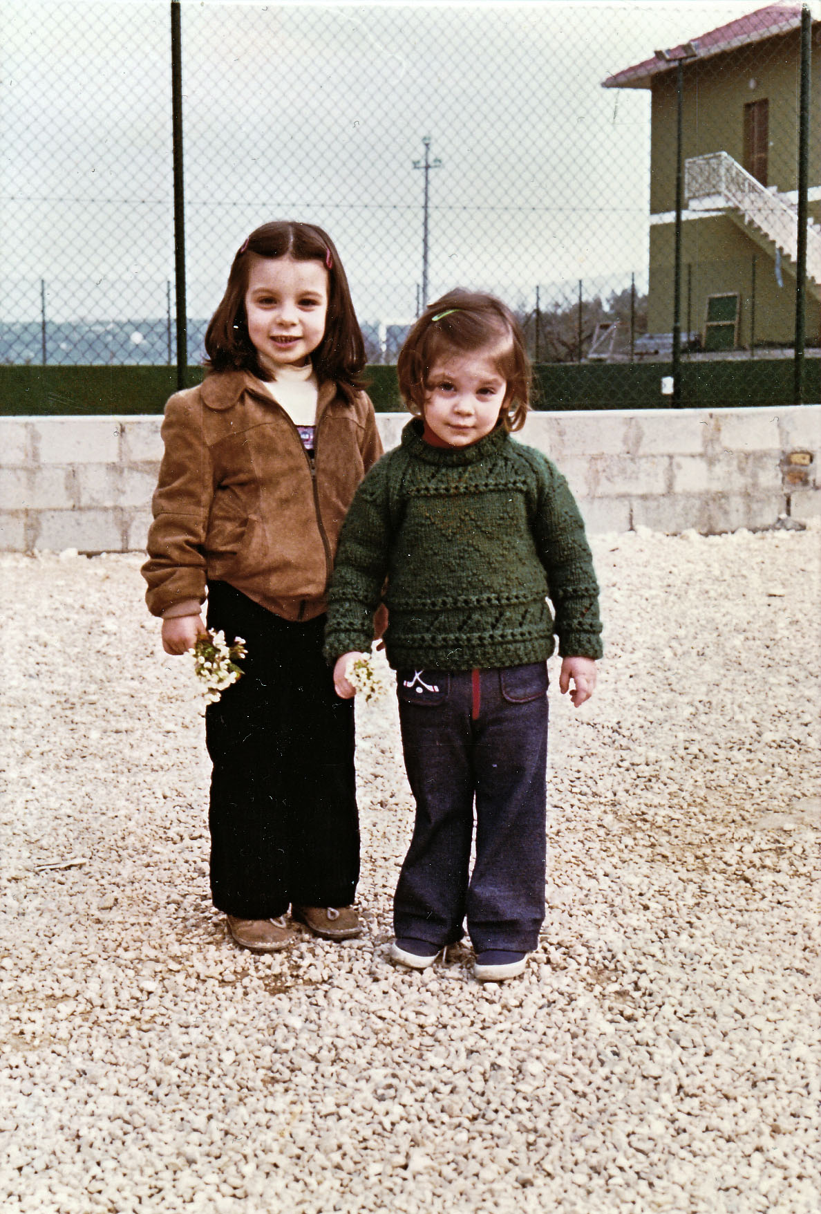How much I like to open that big box and look at all the photos from my past, from when I was little, from my childhood and adolescence! Each of those photos takes me straight to places never forgotten, reminds me of distant people who, however, have remained etched in my heart, the aromas, flavors and sounds that have accompanied my growth for better or for worse resurface. So this photo came into my hands: it was 1981, I was only five years old, and I was in Pescara, my beloved “adoptive” city, where I lived for 10 years, the occasion was the awarding of a tennis tournament organized by the large company where my father worked, of which he was the administrative director, Pirelli. Here I wore one of the pieces that will remain my favorite forever, a suede leather jacket with knitted edges and wide-leg shorts in navy blue velvet. My sister, on the other hand, wore a beautiful sweater handmade by my mother, in military green and jeans. That’s exactly what gave me the idea of making a similar one for me.