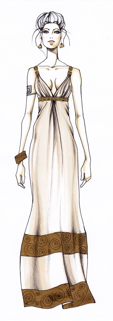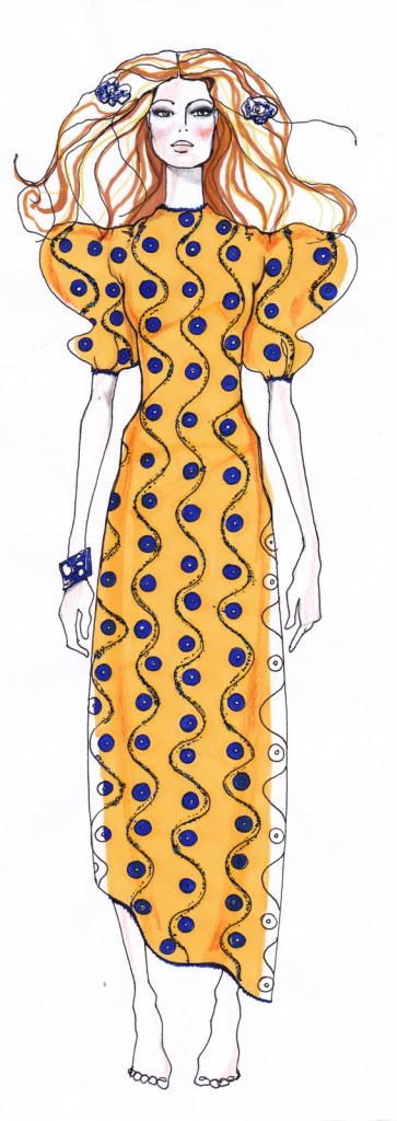 Per questo mi sono ispirata a lui per la realizzazione di questi disegni. Abiti eccentrici ma originali, dalla bellezza fuori dal comune. La capsule ispirata a Klimt è una celebrazione della bellezza e dell’arte, che unisce i motivi iconici dell’artista austriaco a capi di abbigliamento moderni e femminili. La collezione comprende abiti, gonne, pantaloni e accessori, tutti caratterizzati da stampe e ricami che richiamano le opere più famose di Klimt, come “Il Bacio” e “Giuditta”. I colori utilizzati sono quelli tipici dell’artista, ovvero oro, argento, blu e verde, e i tessuti sono di alta qualità, come seta, velluto e pizzo. La collezione è stata creata per donne che amano la moda e l’arte, e che desiderano indossare capi unici e originali.