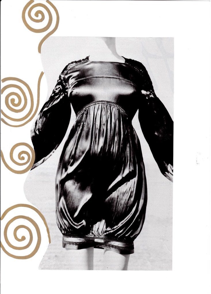 Disegnò abiti ispirati alle stampe dei suoi quadri, caratterizzati da segni curvilinei ed arzigogolati, da simboli dorati dalle caratteristiche linee ondulate. L’atmosfera dei quadri di Klimt è un caleidoscopio di sensazioni che spazia dal sensuale all’enigmatico, dal lussuoso al mistico. È un mondo dove la bellezza femminile si intreccia con motivi ornamentali, dove l’oro luccica e la natura si trasforma in un linguaggio simbolico.