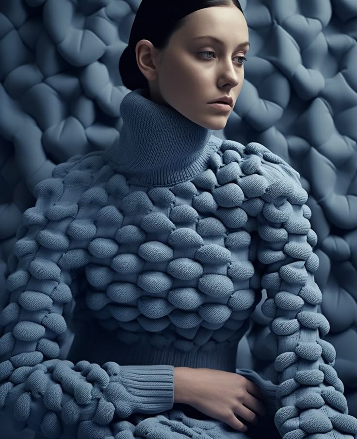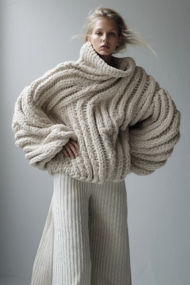 Volumi over e silhouette audaci, i volumi sono ampi e avvolgenti. I maglioni diventano quasi delle sculture, con spalle larghe e forme couture che esaltano il corpo in modo non convenzionale. Contrasti di texture, la maglieria pesante e voluminosa viene spesso abbinata a tessuti leggeri e preziosi come la seta, creando un contrasto affascinante tra materie opposte. Il comfort diventa avvolgente e protettivo: la maglieria abbraccia “volumi morbidi e avvolgenti” che “disegnano silhouette a bozzolo, dove il corpo si perde e si protegge”. Questa tendenza è ulteriormente supportata dalla prevalenza di “maglioni oversize” e “vestiti in maglia ampi e sciolti”.