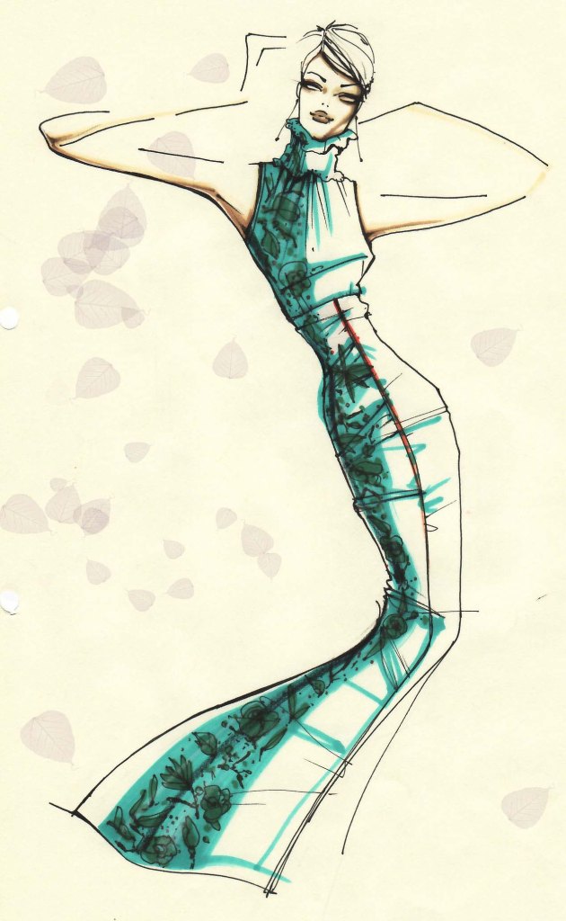 E poi la mia creazione: dal tratto fluido e istintivo del figurino prende vita un abito elegante e slanciato, dove l’azzurro Tiffany scivola lungo la silhouette come una pennellata leggera. Le linee disegnate, quasi sospese tra precisione e spontaneità, si trasformano grazie all’AI in un look reale sofisticato e contemporaneo: il vestito aderente valorizza la figura, mentre i dettagli grafici diventano delicati motivi decorativi che aggiungono carattere. L’ambientazione estiva amplifica il concept originale, portando il disegno fuori dalla carta e dentro un lifestyle luminoso e mediterraneo. Il risultato è una perfetta fusione tra creatività artistica e innovazione digitale, dove l’idea prende forma e diventa esperienza visiva.